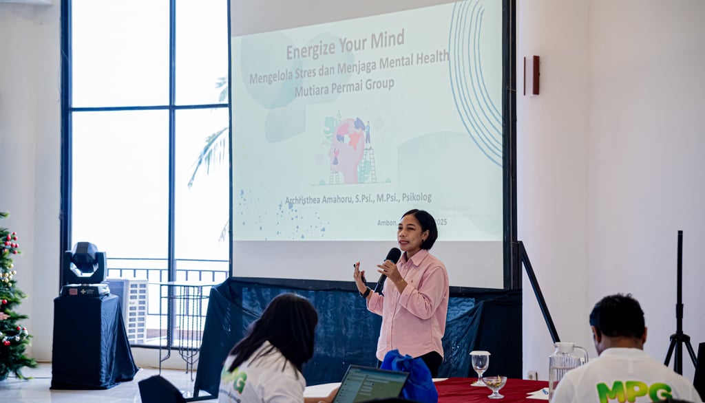 Ambon, 05 Desember 2025 – Sebagai bagian dari rangkaian acara Family Gathering dan Grand Noel Mutiara Permai Group (MPG) 2025, sesi pemaparan materi dan diskusi kesehatan mental bertajuk “Mengelola Stres dan Menjaga Mental Health Mutiara Permai Group” berhasil menarik perhatian peserta. Kegiatan ini berlangsung selama 100 menit di Ballroom The Natsepa Resort & Conference Center, Ambon, pada 5 Desember 2025.